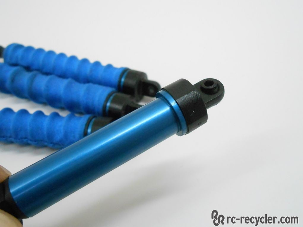 This is a set of 4 Axial big bore coil over rock crawler shocks with TiNi coated rods. Features STRC STA30122B Blue Aluminum Shock Bodies and blue shock covers. These measure 115mm eye to eye uncompressed and 80mm eye to eye fully compressed. These are in excellent condition with minimal wear from use. - Additional Information