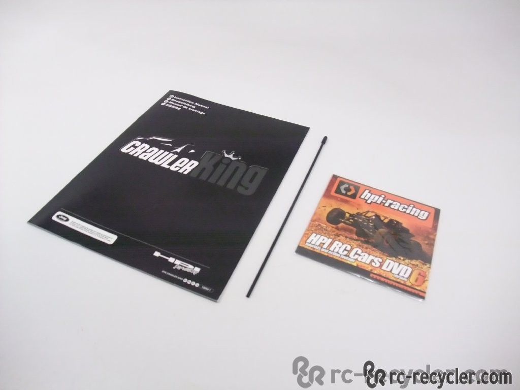 This is an instruction / assembly for the HPI Crawler King 4X4 Crawler. This set includes the Crawler King manual, antenna tube, and instructional DVD. These are new from an RTR Crawler King, they have never been used. - Additional Information