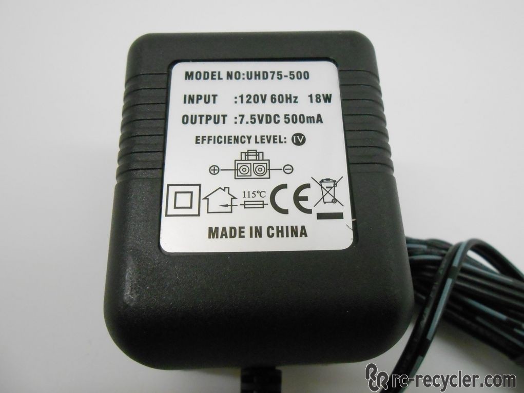 This is a 7.5V 500mA peak Ni-Cd and Ni-MH battery charger. Part number UHD75-500 This is in excellent condition and has been tested to function normally. Specs: Model Number: UHD75-500 Input: 120V 60Hz 18W Output: 7.5VDC 500mA - Additional Information
