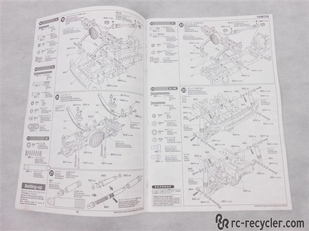 This is the assembly manual for the Tamiya Toyota Tundra High-Lift kit. Covers assembly instruction with exploded part views and parts list. This is in good condition with light signs of use. - Additional Information